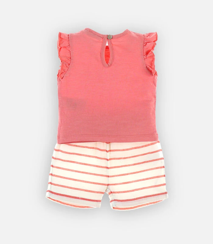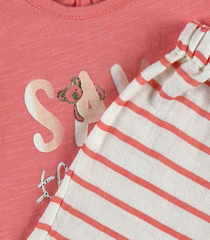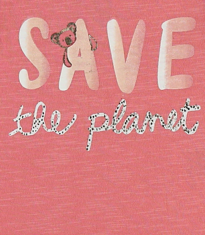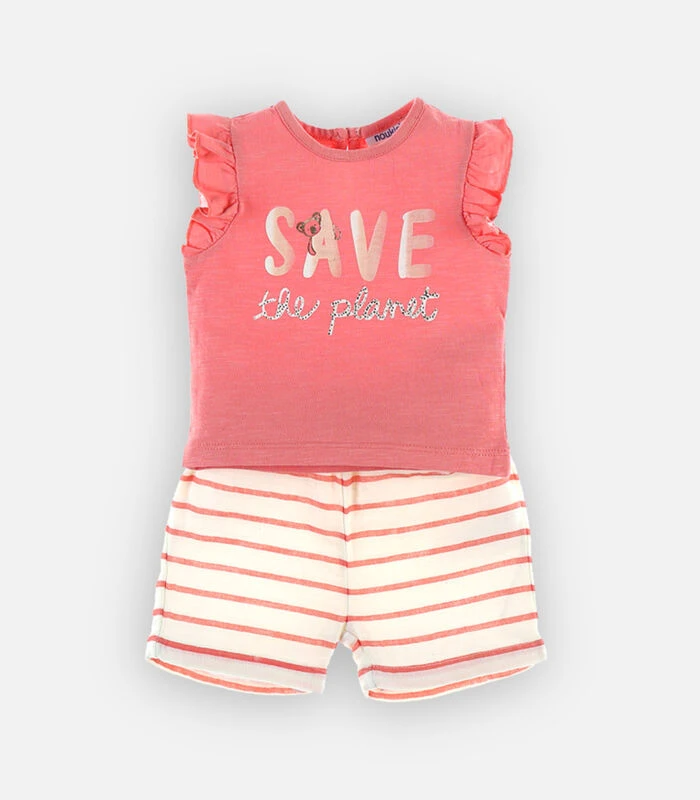 Ultra praktisch BIO katoenen koraal setje met een t–shirt bedrukt met “Save the planet” en een gestreepte short. Dit luchtige en comfortabele setje is een must–have in de zomerkleerkast van je kleintje. Wij zijn fan van zijn strookmouwen !