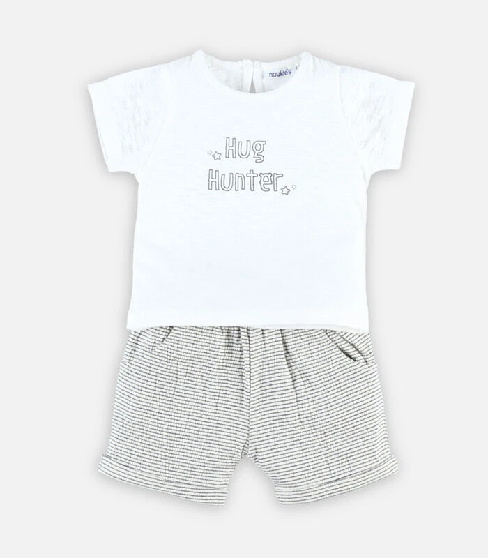 Ultra praktisch setje met ecru T–shirt uit katoen en een gestreepte short. Dit luchtige, comfortabele setje is een must–have in de garderobe van je baby of kind. Wij zijn fan van zijn klein detail op de voorkant.
