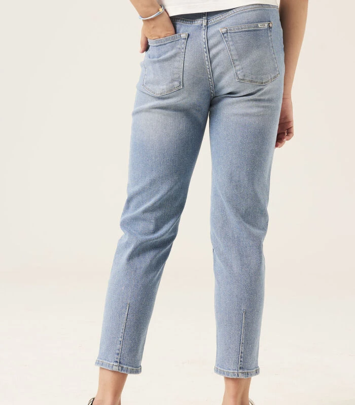 De 585 is een echte must–have met eem mom fit en een hoge taille. De jeans heeft tapered leg en heeft daardoor pijpen de recht toelopen naar de enkels. De jeans sluit met een rits– en knoopsluiting en heeft 5 zakken.
