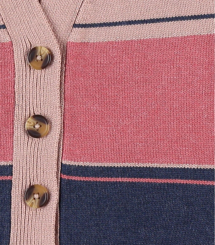 De driekleurige gebreide cardigan met ballonmouwen is voorzien van knoopjes. Deze trendy cardigan is afgewerkt met goudkleurige lurex. Een tijdloze kledingstuk in de kleerkast!