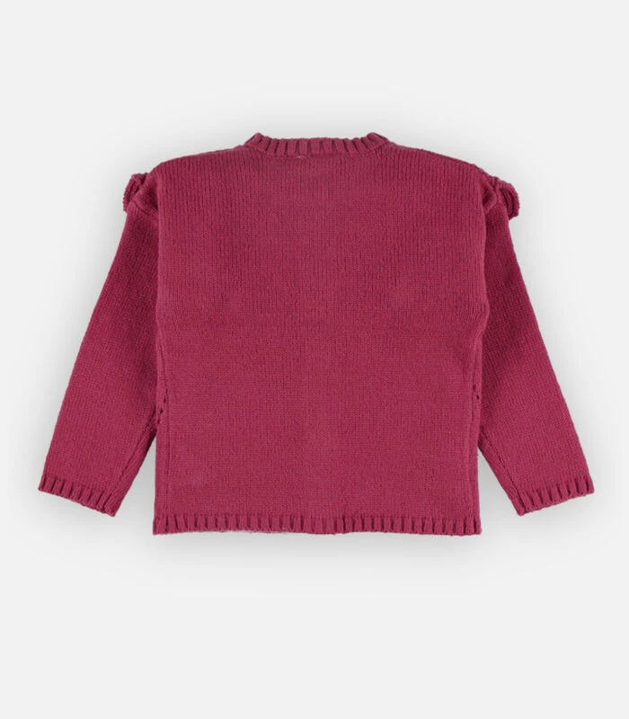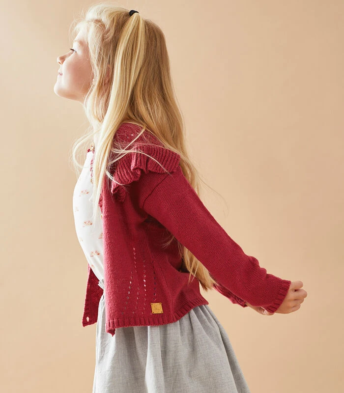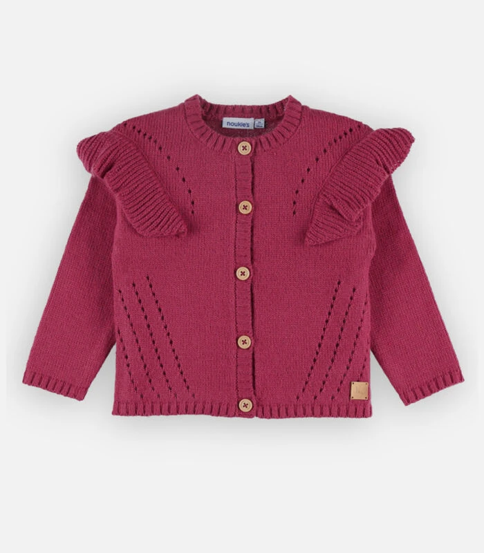 De framboosrode gebreide cardigan met ronde hals en lange mouwen is voorzien van houten knoopjes. De elegante ruches geven een girly touch aan de outfit. Een tijdloze kledingstuk in de kleerkast!