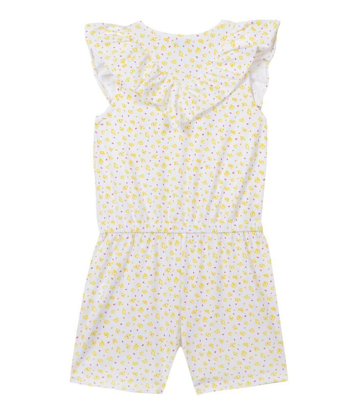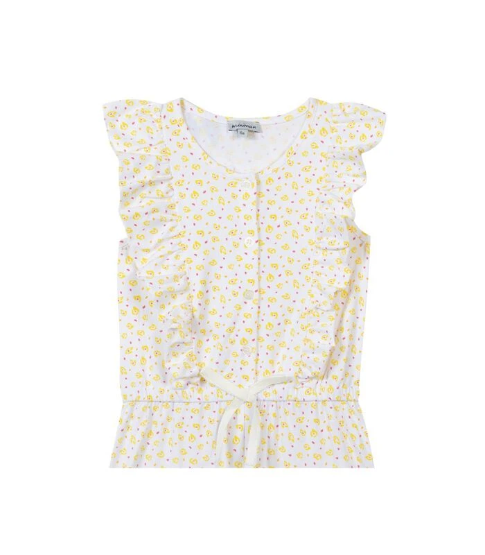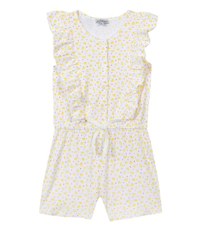 Product details: Ultracomfortabel voor de mooie dagen, gebreide combishort met ruches en print, met knoopsluiting vooraan en elastiek in de taille. Eco–ontworpen product: gebruik van stoffen uit Europa, productie in beperkte series en nabijheid tot minder dan 1500 km van Frankrijk. Samenstelling en verzorging: 94%COTTON 6%ELASTHANNE Wassen 30°C normale cyclus