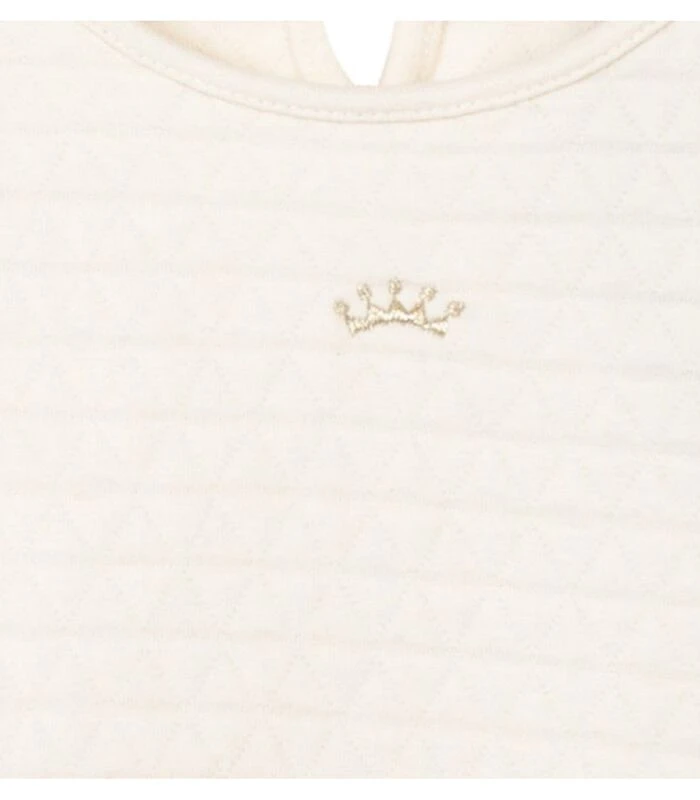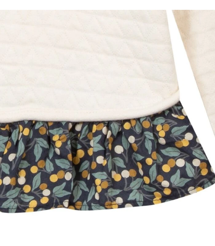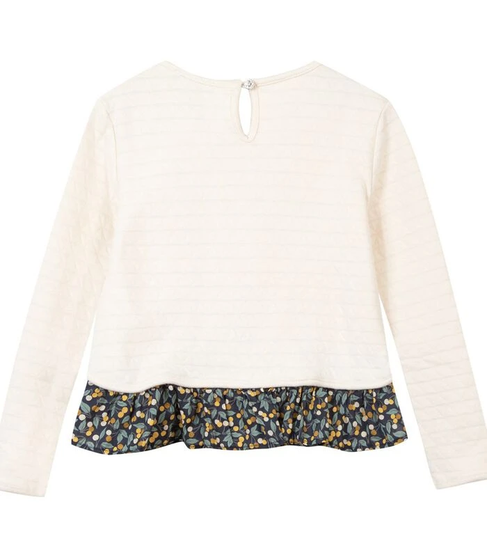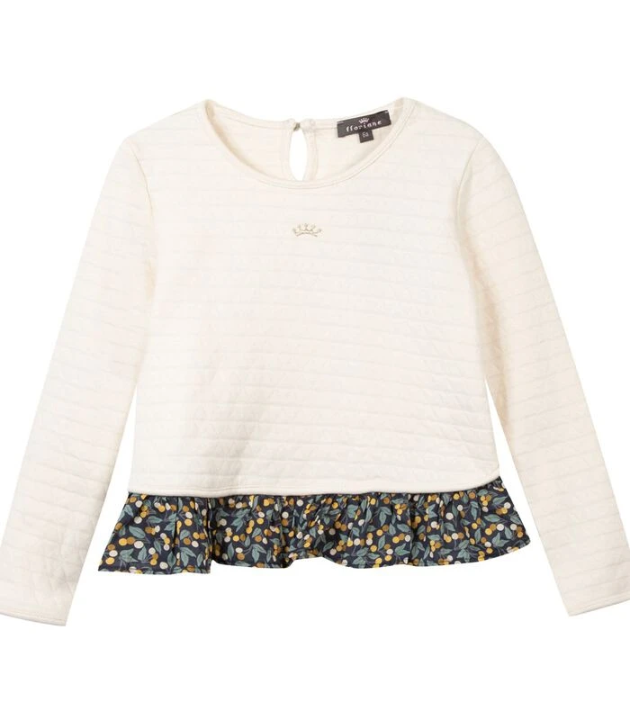 Product details: Edele gebreide trui met bedrukte ruches en geborduurd lurexmotief. Eco–ontworpen product: gebruik van stoffen uit Europa, productie in beperkte series en nabijheid tot minder dan 1500 km van Frankrijk. Samenstelling: Hoofdstof: 80%COTTON 20%POLYESTER Ruches: 100%COTTON Onderhoud: Wassen op 30°C normaal programma