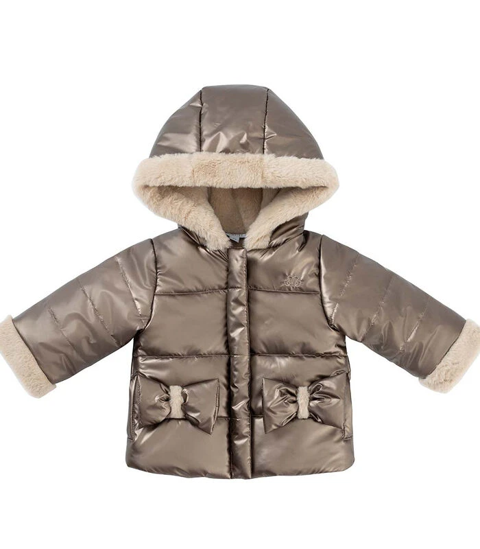 Warme winterjas in brons met kap en ritssluiting. De jas heeft vooraan twee strikken en de binnenzijde van de kap is afgewerkt met beige faux fur.