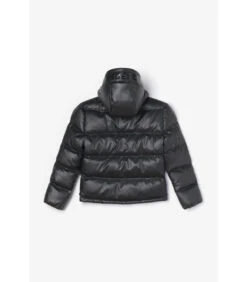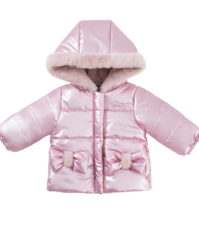 Roze winterjas met kap en ritssluiting. De jas is gemaakt uit een blinkende kwaliteit en heeft twee strikken op de voorzijde. De binnenkant is afgewerkt met roze faux fur.
