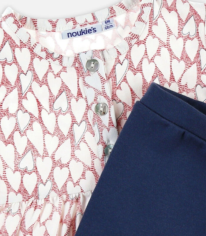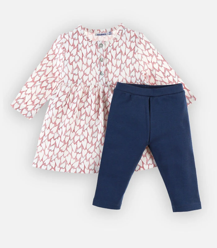 Deze set bestaande uit een ecru en roos jurkje met hartjes en lange mouwen en een donkerblauwe legging is super schattig. Meisjes zullen er gek op zijn! Dit jurkje met een ronde halslijn en mooie knoopjes vooraan vis perfect voor de herfst of de winter. In een woord: perfect voor elke gelegenheid!