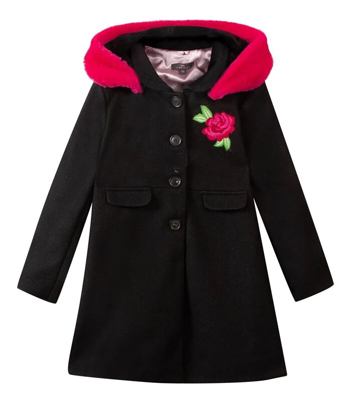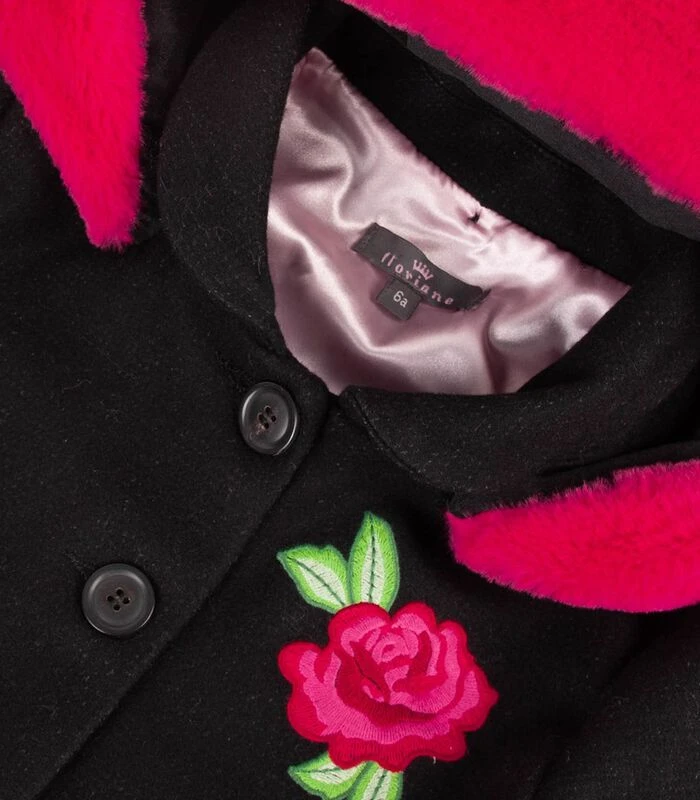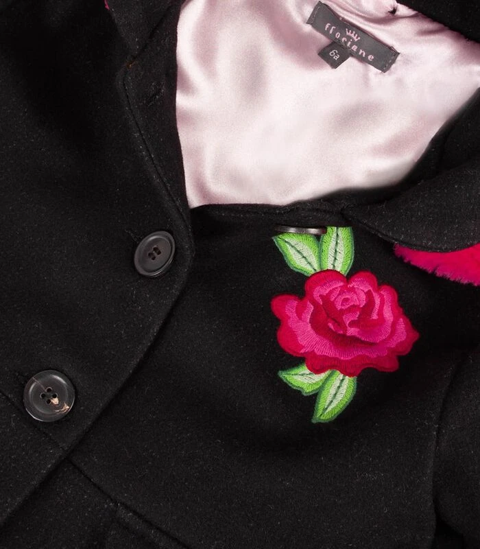 Product details: Mantel van wollen laken met afneembare capuchon van imitatiebont, volledig gevoerd en geborduurd bloemmotief. Eco–ontworpen product: gebruik van stoffen uit Europa, productie in beperkte series en nabijheid tot minder dan 1500 km van Frankrijk. Samenstelling: 77%VIRGINE WOL 17%POLYAMIDE 6%POLYESTER Voering 100%POLYESTER Onderhoud: Wassen op 30°C normaal programma