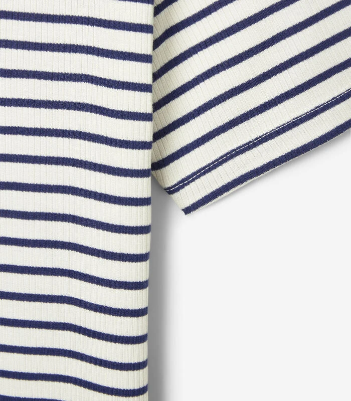 Een moderne, supercasual basic voor het nieuwe seizoen: gestreepte jurk van geribde jersey in T–shirt–stijl van zachte, elastische lyocell met een beetje elastaan. Lang, recht model met klassieke ronde hals, korte mouwen en zijsplitten aan één kant. Perfect voor vrolijke zomerdagen.