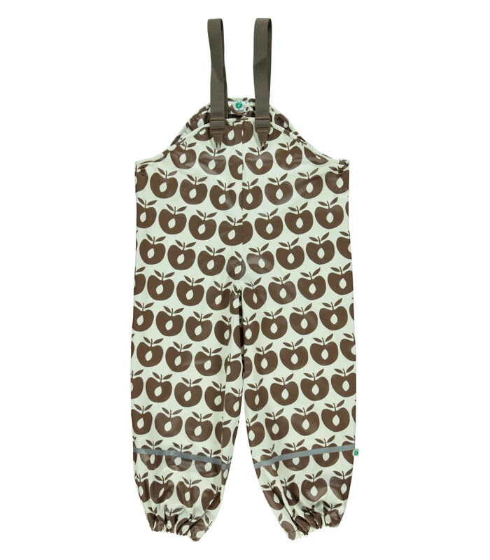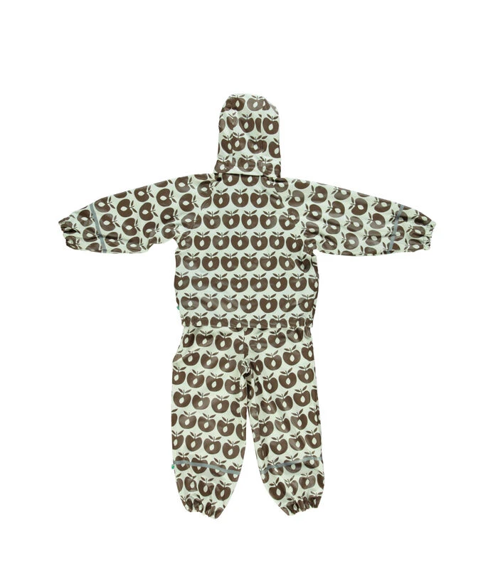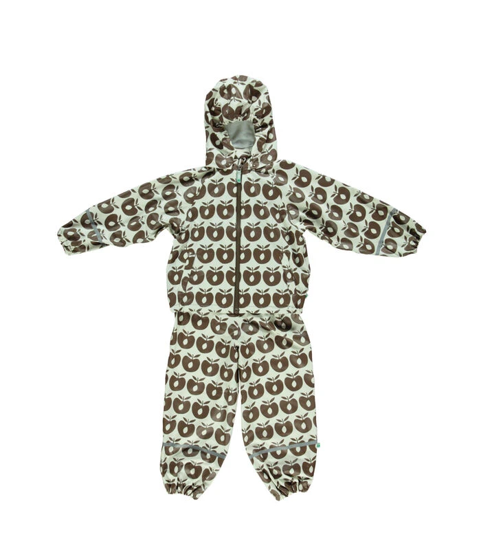 Regenset met appels van Småfolk. Houdt uw kind ervan om in de regen naar buiten te gaan, in plassen te springen of na de zomerregen een heerlijke boswandeling te maken? Maak je geen zorgen. Uw kind wordt niet nat, want de regenset van Småfolk is vooral goed bij modderig weer! De set heeft een afneembare capuchon, ritssluiting, getapete naden, twee zakken met rits, reflectoren op de mouwen en benen en elastiek onderaan de broekspijp. De regenbroek heeft ook bretels. De regenkit is vrij van PVC en ftalaten.