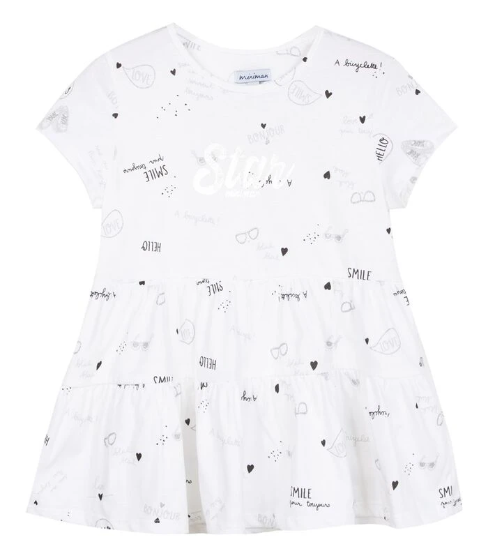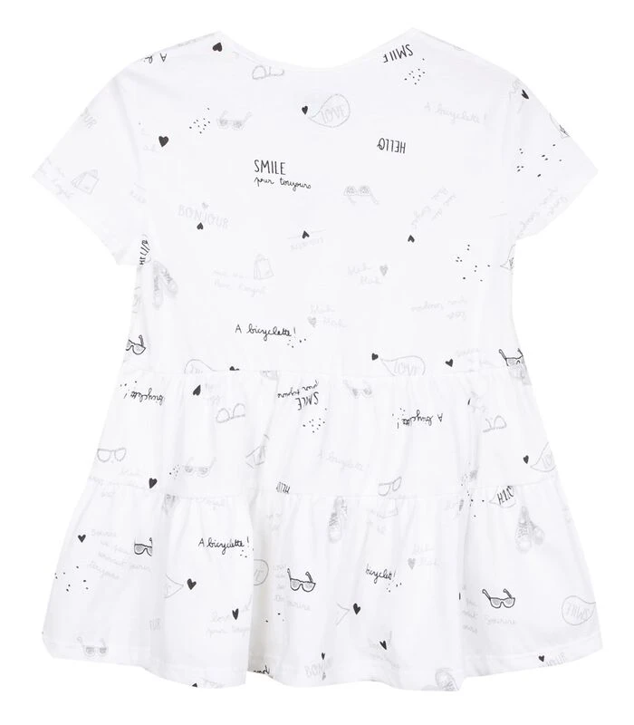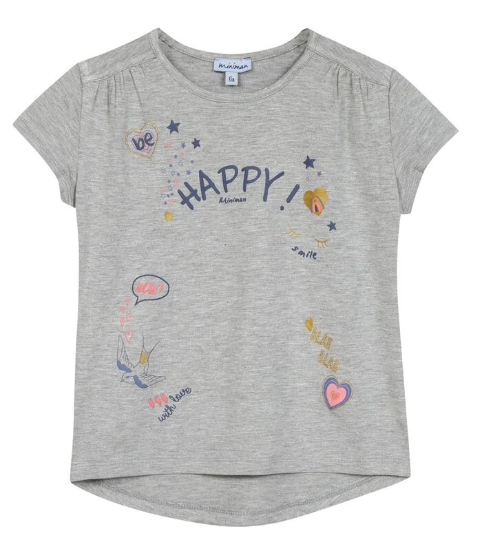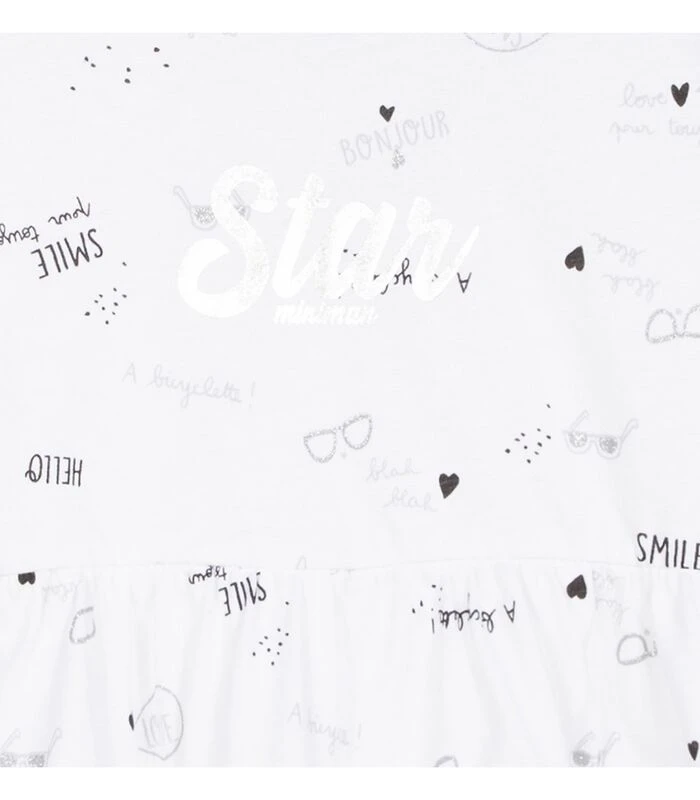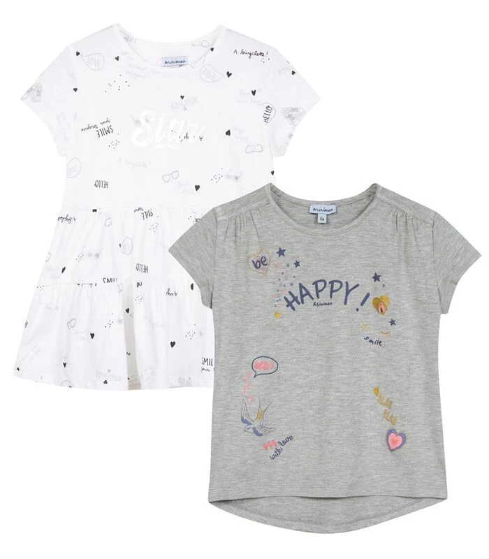 Productdetails: Ultrapraktisch en gemakkelijk te onderhouden, set van 2 meisjes–T–shirts met korte mouwen: een losjes vallend koppel–T–shirt met ruches en een effen T–shirt met fantasieprint. Â