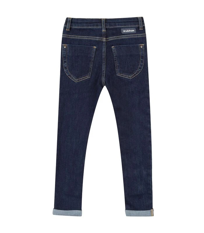 Product details:  Indigo slim fit jeans met een geborduurde badge op de voorkant voor een meer rockende look.  Wij houden ervan vanwege het rekbare katoen dat zorgt voor optimaal comfort. Verstelbare taille met geknoopt elastiek.  Milieuvriendelijk product: gebruik van stoffen uit Europa, productie in beperkte series en nabijheid van minder dan 1500 km van Frankrijk.  Samenstelling en verzorging:  98% KATOEN 2% ELASTHAAN  Wassen op 30°C normaal programma