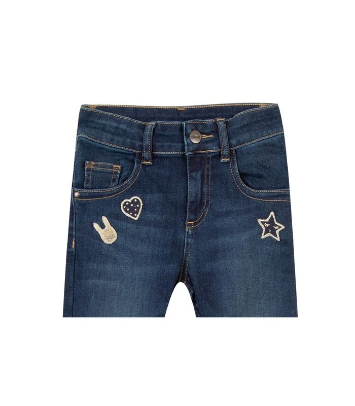 Product details:  Indigo slim fit jeans met geborduurde badges op de voorkant voor een rocker look.  Wij houden ervan vanwege de rekbare katoenen stof die zorgt voor optimaal comfort. Verstelbare taille met elastische knopen.  Eco–ontworpen product:  gebruik van stoffen uit Europa, beperkte productie en nabijheid op minder dan 1500 km van Frankrijk.  Samenstelling en verzorging: 98%COTTON 2%ELASTHANNE  Wassen op 30°C normaal programma  Â