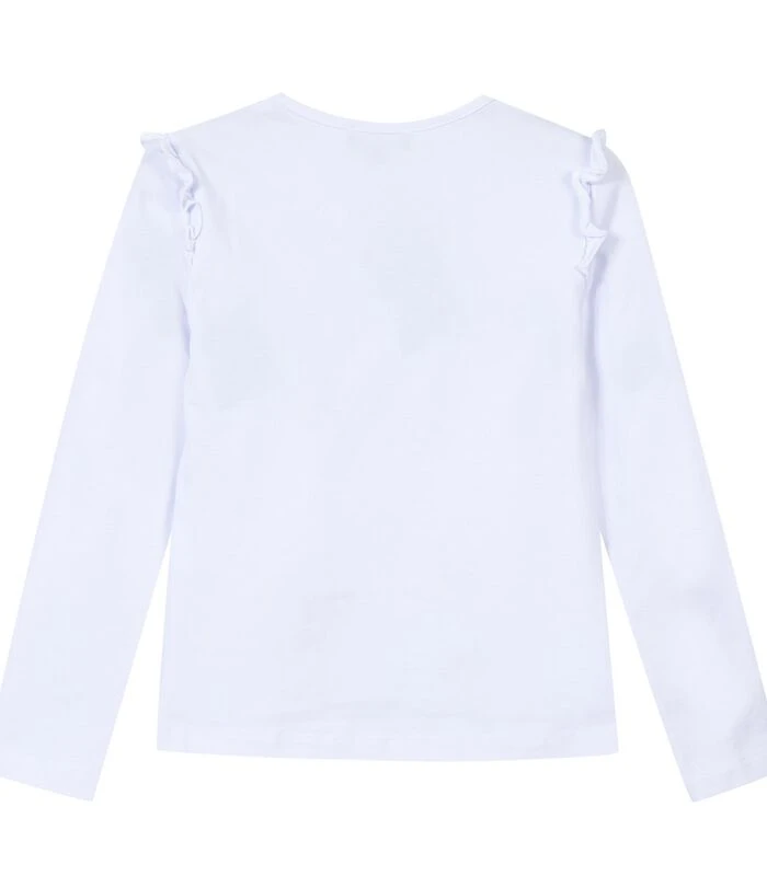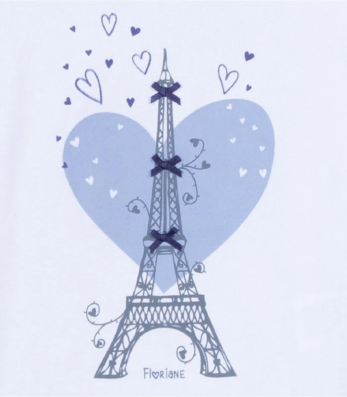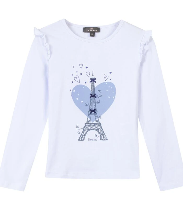 Product details: T–shirt voor meisjes met lange mouwen in jersey met ruches en Eiffeltorenprint. Eco–ontworpen product: gebruik van stoffen uit Europa, productie in beperkte series en nabijheid tot minder dan 1500 km van Frankrijk. Samenstelling: 95%COTTON 5%ELASTHANNE Onderhoud: Wassen op 30°C normaal programma