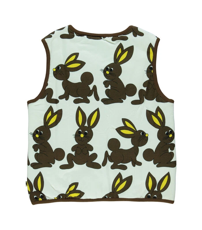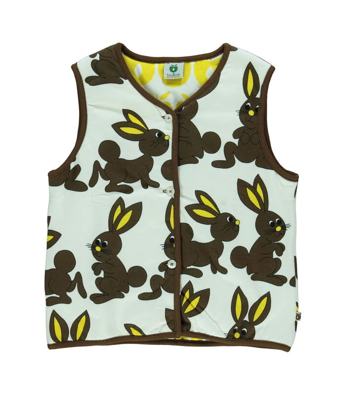 Bunny en Apple omkeerbaar vest van Småfolk. De stofcombinatie zorgt voor de allerbeste, zachte en rekbare kwaliteit. Småfolk is een klein Deens merk dat kinderkleding maakt met kleurrijke prints en creatieve, fantasierijke motieven. Het omkeerbare vest is perfect bij koel weer.
