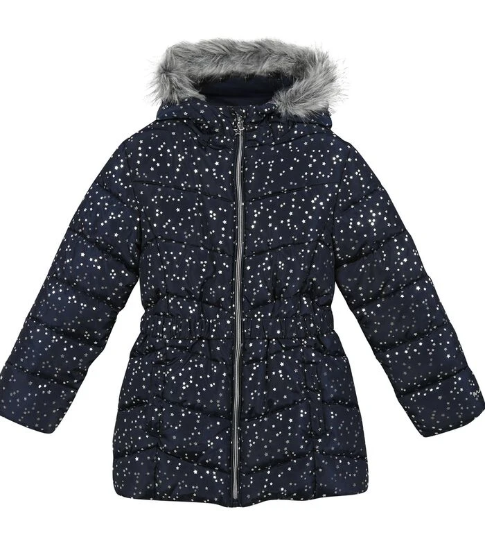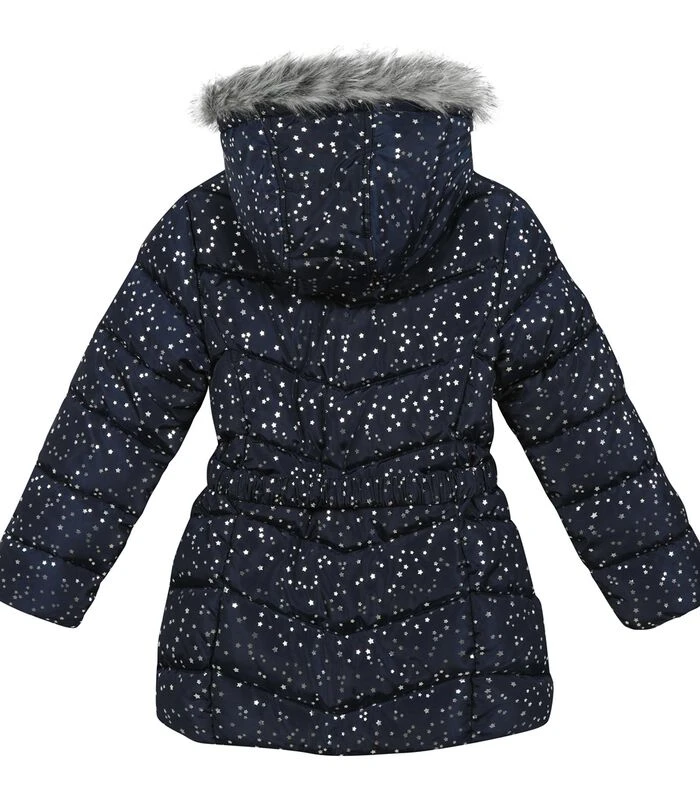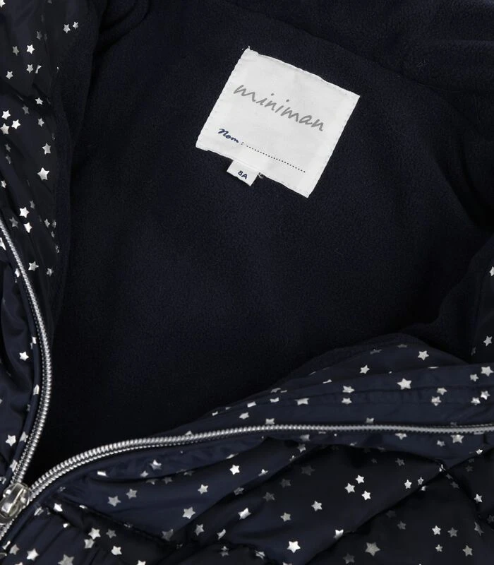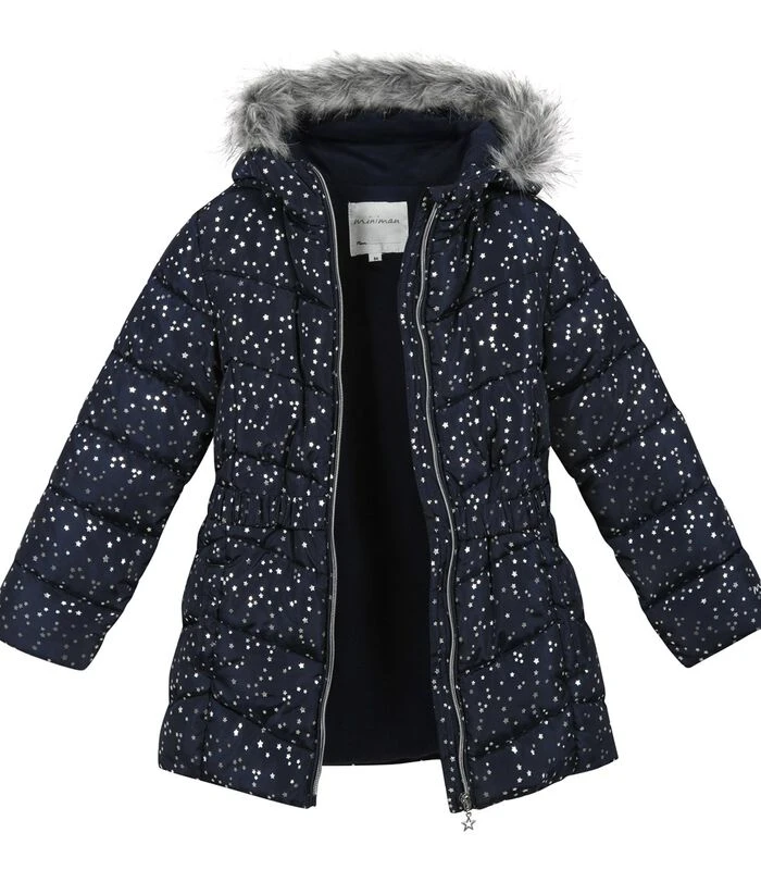 Product details: Warme halflange donsjas met capuchon, gewatteerde voering en zilveren sterprint. Hoge kraag en grote capuchon met imitatiebontrand. Zacht, waterafstotend materiaal. Voering van de romp en capuchon in marineblauwe fleece. Strakke taille. Gepaspelde zakken. Zilveren Miniman borduursel op de mouw. Mooie rits met sterschuif en druklipje. Samenstelling: 100%POLYESTER Verzorging: Wassen 30°C normale cyclus